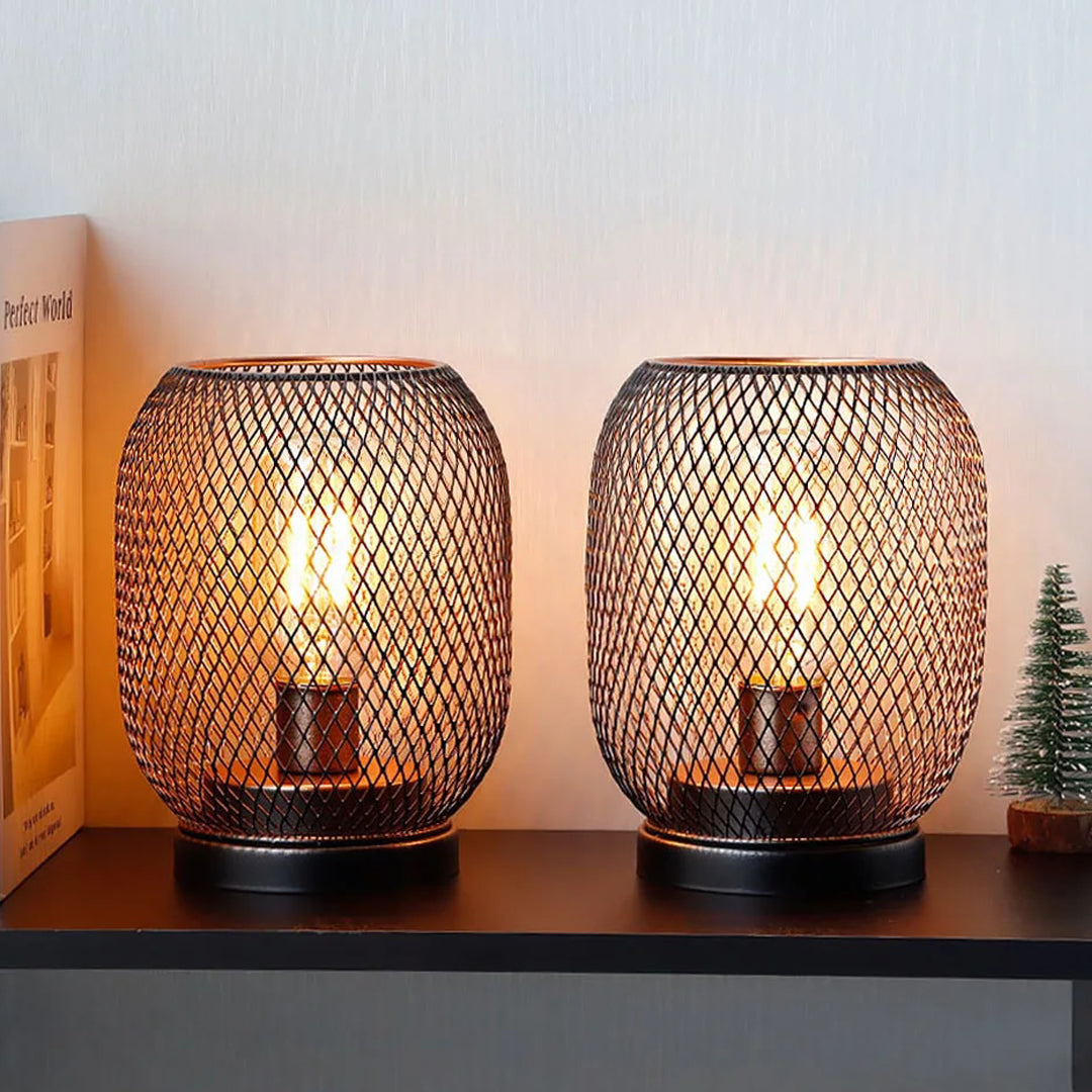 A stunning pair of cage shaped luminaires that blend contemporary design with industrial flair. The intricate metal cages encase the light source, casting a captivating play of shadows and light, making these lamps a stylish and functional addition to any room.