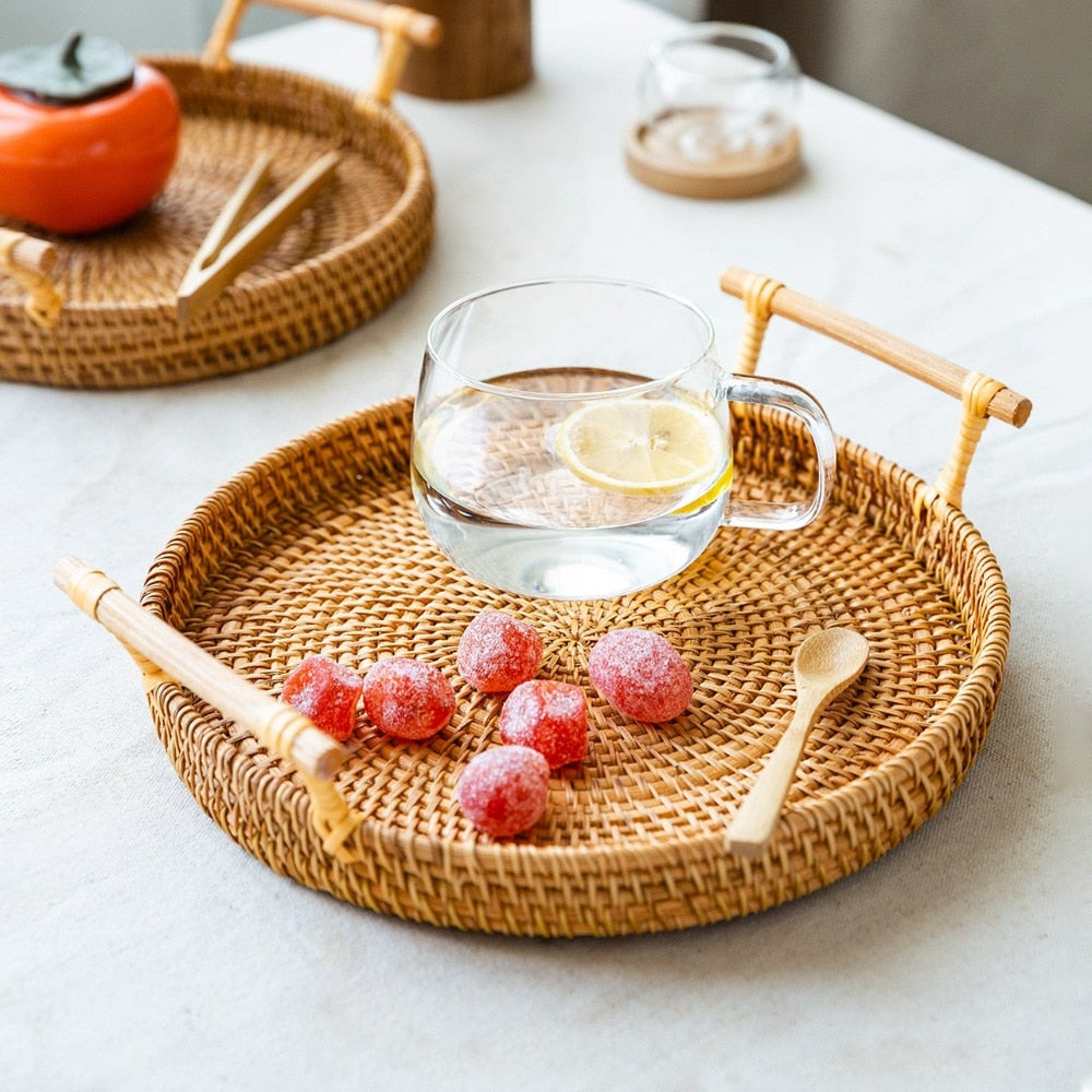 Handwoven circular pattern tray, exclusive collection for any kitchenware. Beautiful design, modern glance piece ensures one of a kind home decoration. Convenient storage tray for many fruits, bread and much more.